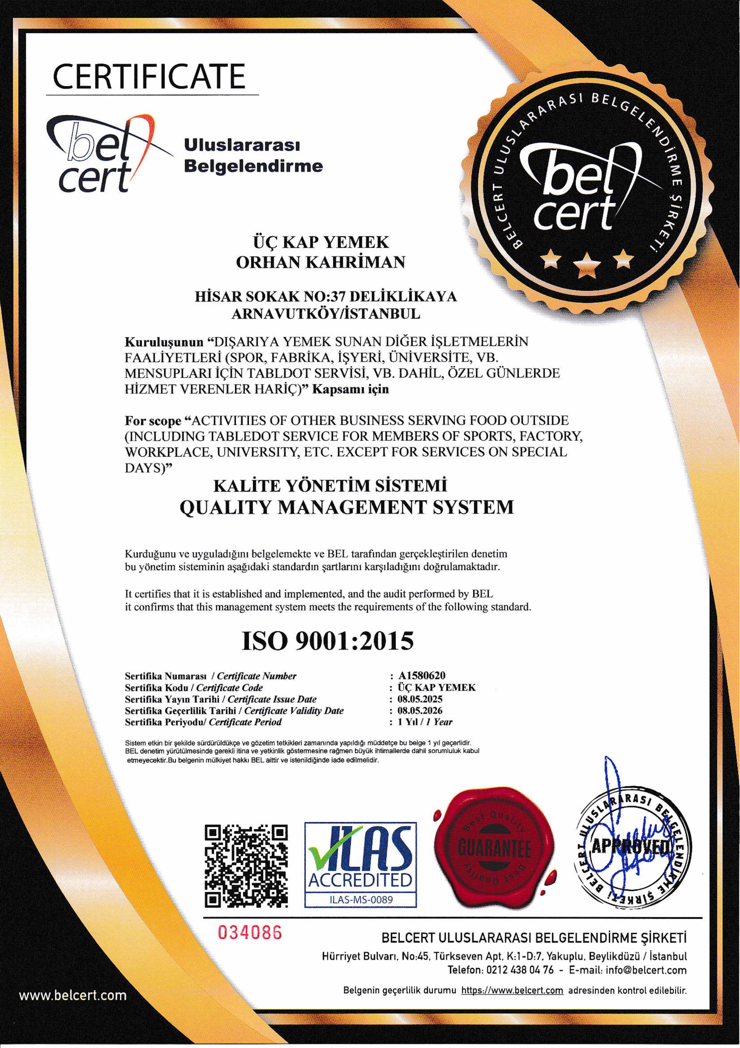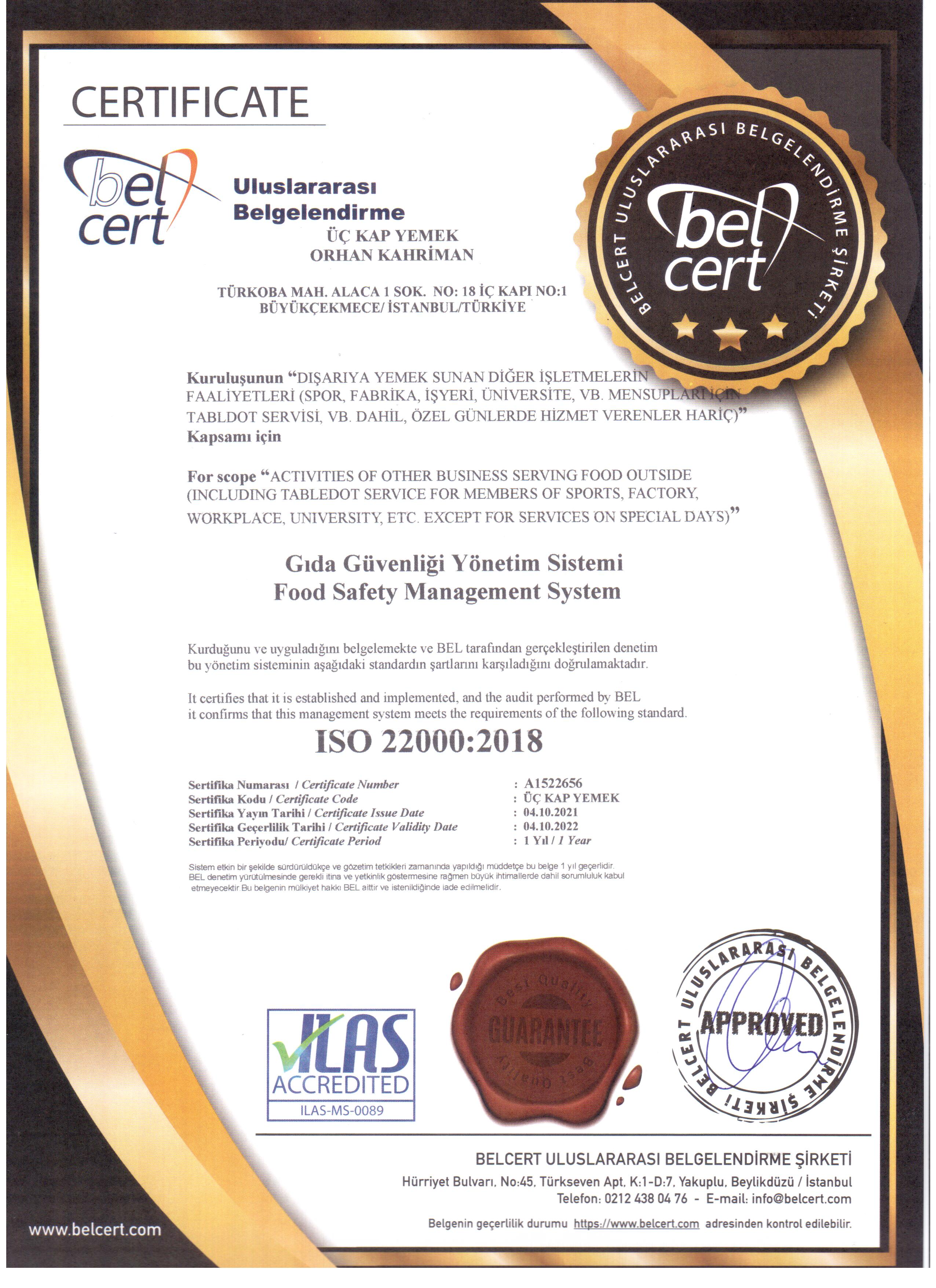 Üç Kap Yemek olarak, üretim süreçlerimizin her aşamasında ISO 22000 Gıda Güvenliği Yönetim Sistemi ve ISO 9001 Kalite Yönetim Sistemi standartlarına uygun olarak çalışıyoruz. Gıda tedarikçilerimizi titizlikle seçiyor, malzeme alımından sunuma kadar her aşamada hijyen kurallarına uygunluğu denetliyoruz.