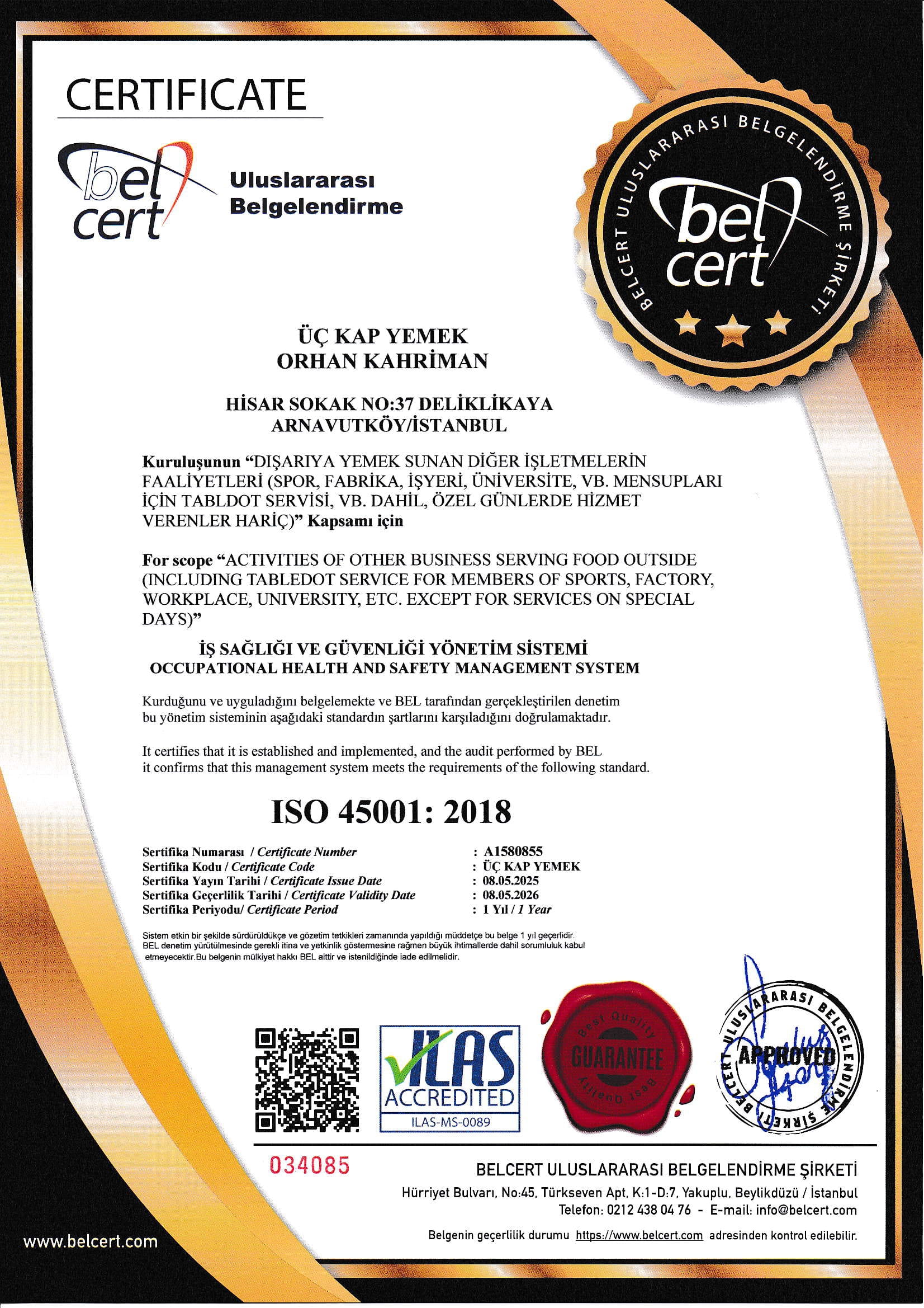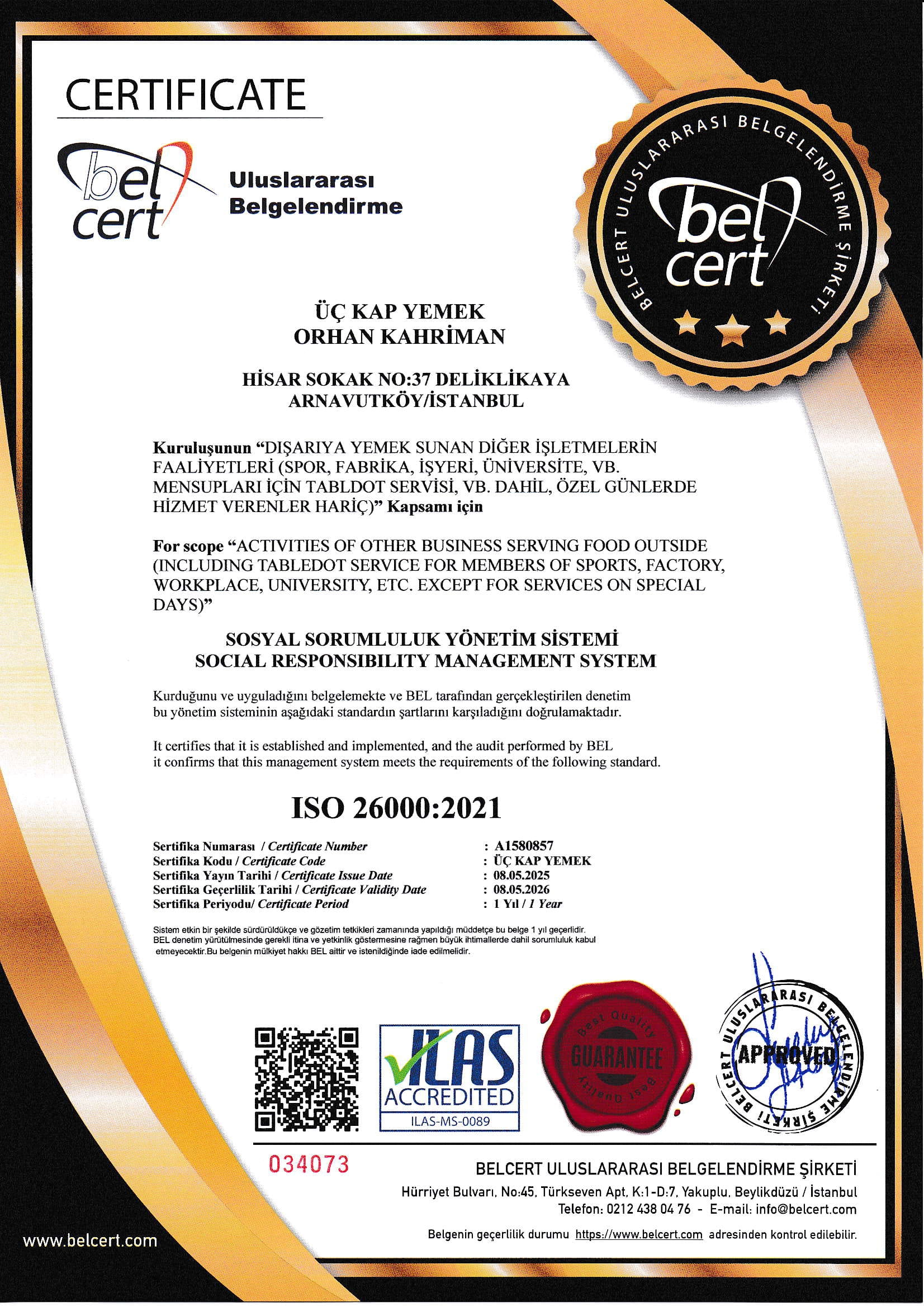 Üç Kap Yemek olarak, üretim süreçlerimizin her aşamasında ISO 22000 Gıda Güvenliği Yönetim Sistemi ve ISO 9001 Kalite Yönetim Sistemi standartlarına uygun olarak çalışıyoruz. Gıda tedarikçilerimizi titizlikle seçiyor, malzeme alımından sunuma kadar her aşamada hijyen kurallarına uygunluğu denetliyoruz.